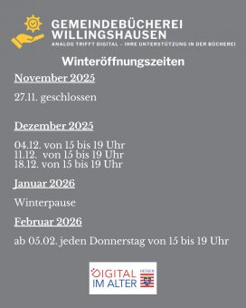 Die Gemeindebücherei Willingshausen ist jeden Donnerstag, außer an Feiertagen, von 15 bis 19 Uhr geöffnet. Sie befindet sich in der Merzhäuser Straße 1, im Erdgeschoss der Kunsthalle neben dem Café.